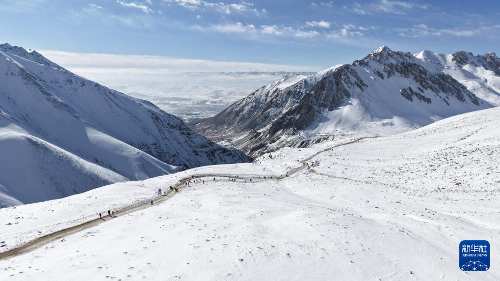 1月1日,登山爱好者在攀登岗什卡雪峰(无人机照片)。新华社记者 齐芷玥 摄