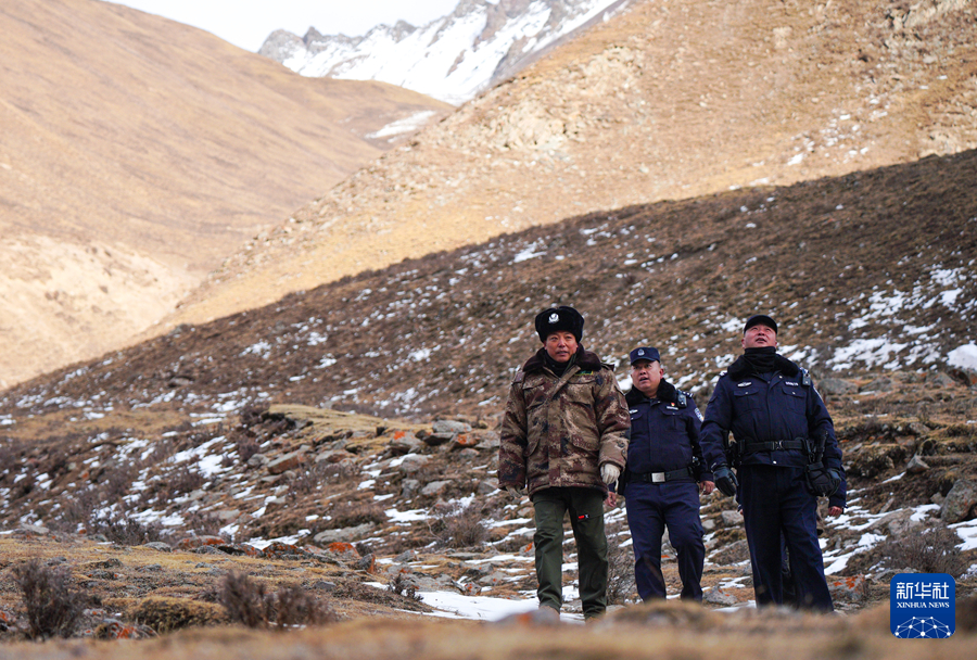 1月8日,在青海省海北藏族自治州门源回族自治县境内的老虎沟,民警魏磊(中)、郭建业(右)和生态管护员李占云(左)在巡护祁连山。新华社记者 齐芷玥 摄