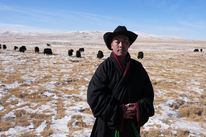 1月31日,青海省玉树藏族自治州曲麻莱县麻多乡郭洋村牧民各求在草原上放牧。新华社记者 张龙 摄