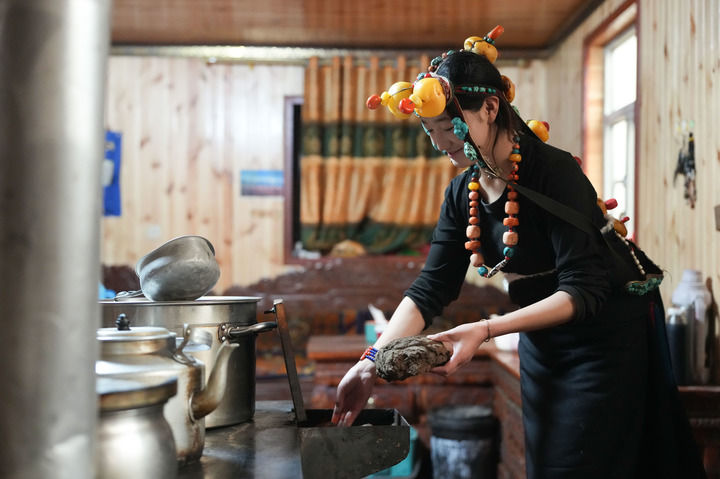 1月30日,在青海省玉树藏族自治州杂多县结多乡达俄村,牧民塔加的女儿在铁炉里添加牛粪。新华社记者 张龙 摄