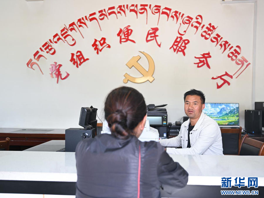 4月13日,在才堂村党组织便民服务厅,工作人员正在为村民讲解医疗保障政策。新华社记者 张龙 摄