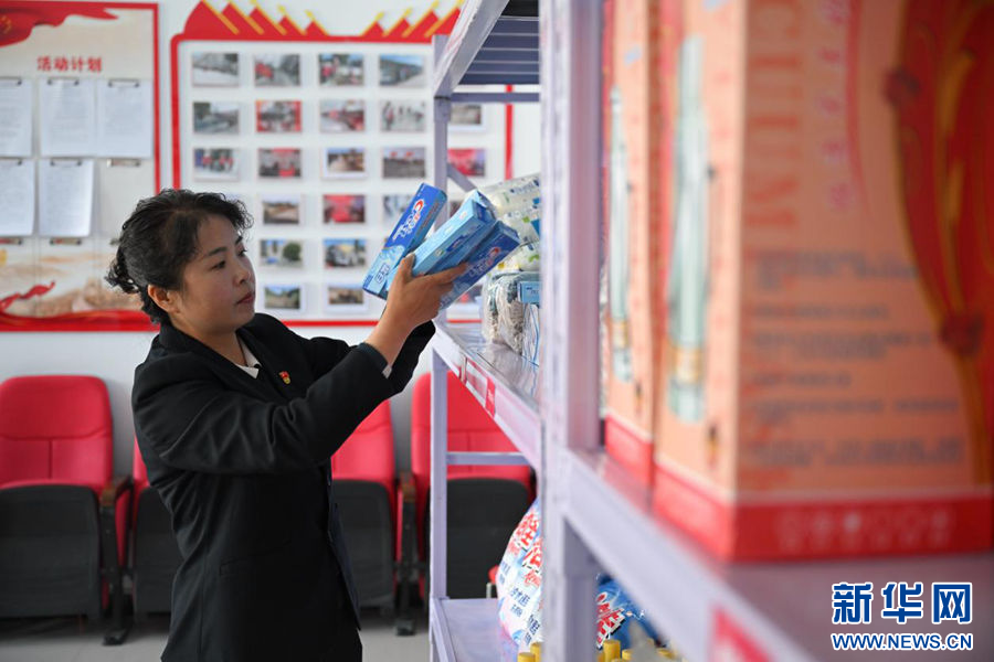 4月13日,才堂村党支部书记胡海英正在整理“积分超市”的奖品。新华社记者 张龙 摄